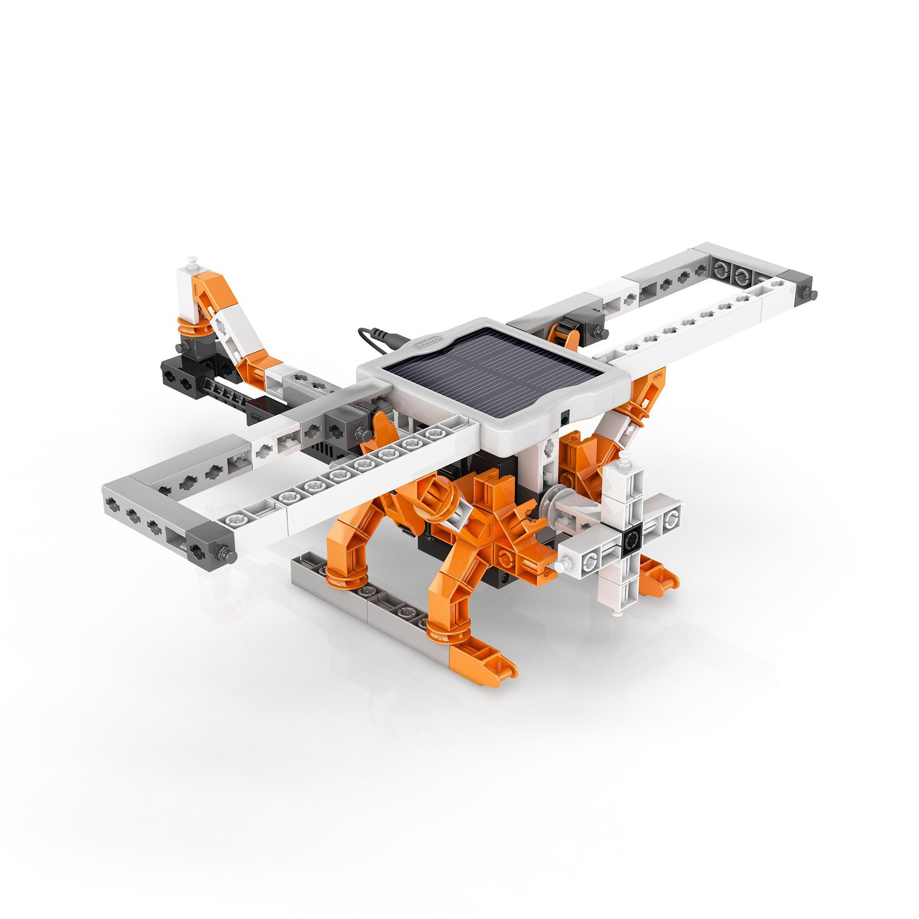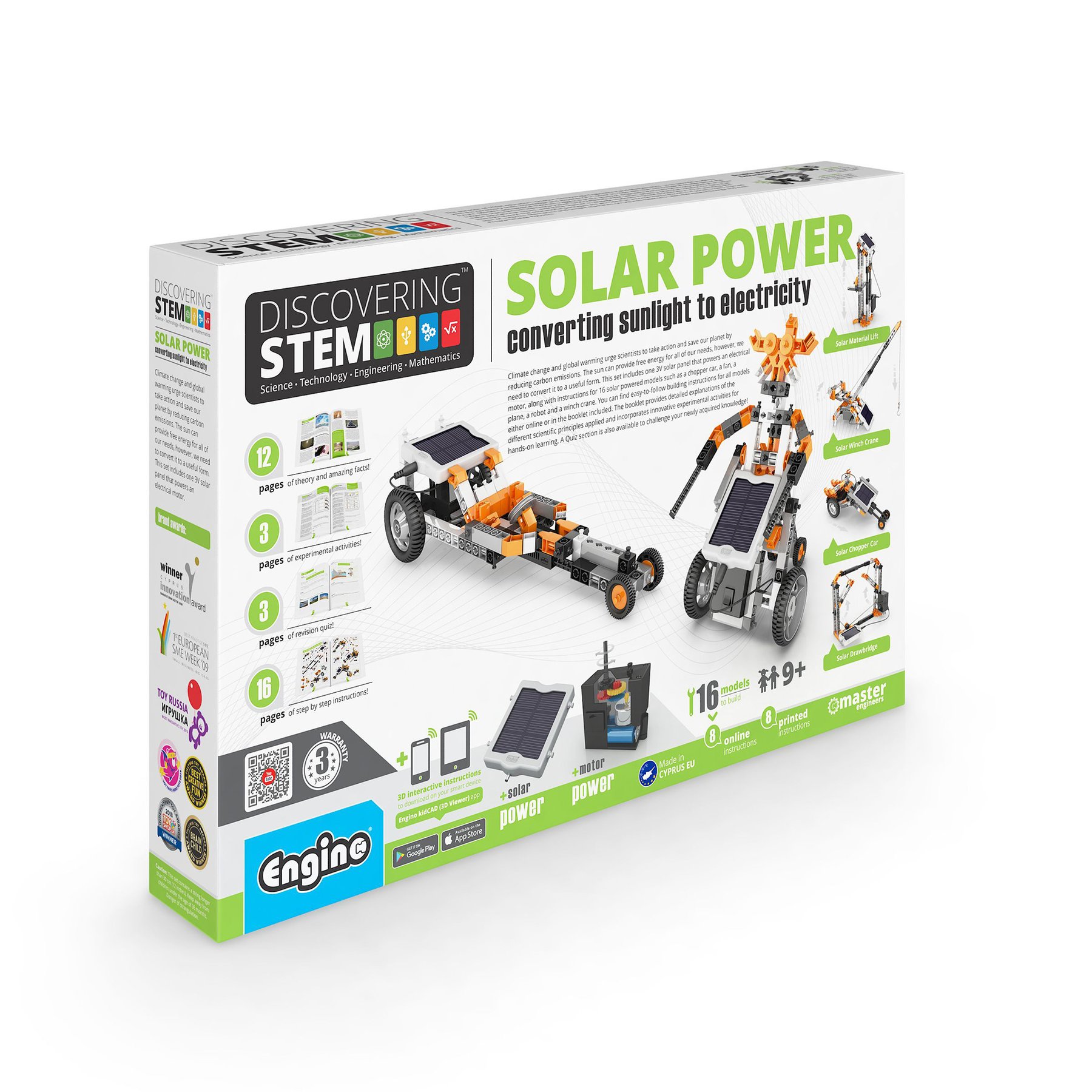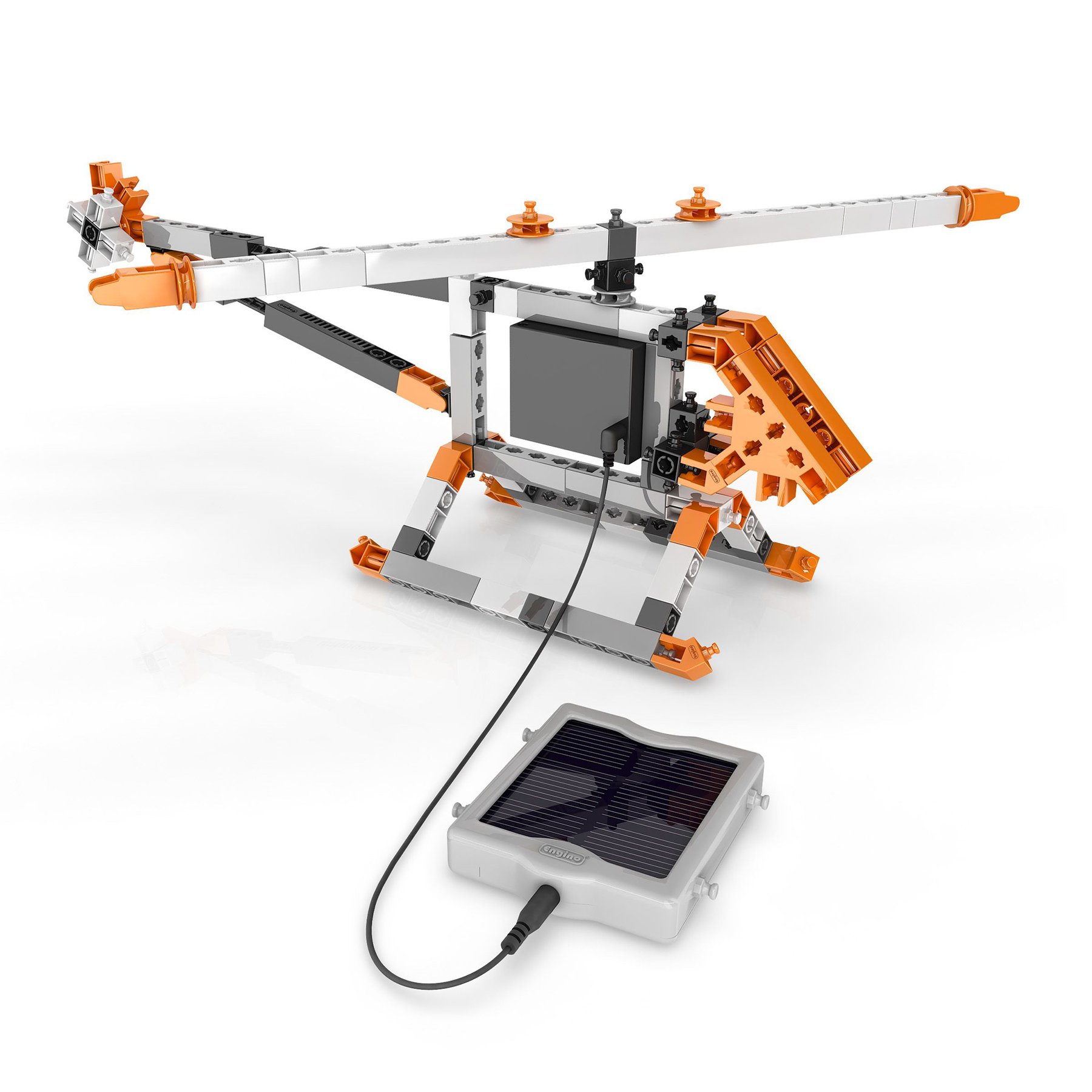 Този комплект включва един 3V соларен панел, който захранва електрически мотор, заедно с инструкции за 16 модела, захранвани със слънчева енергия като хеликоптер, вентилатор, самолет, робот и кран с лебедка. Можете да откриете лесни за следване инструкции за изграждане за всички модели онлайн или във включената книжка. Книжката предоставя подробни обяснения на прилаганите различни научни принципи и включва иновативни експериментални дейности за практическо обучение. Налична е и секция за тестове, за да предизвикате новопридобитите си знания!