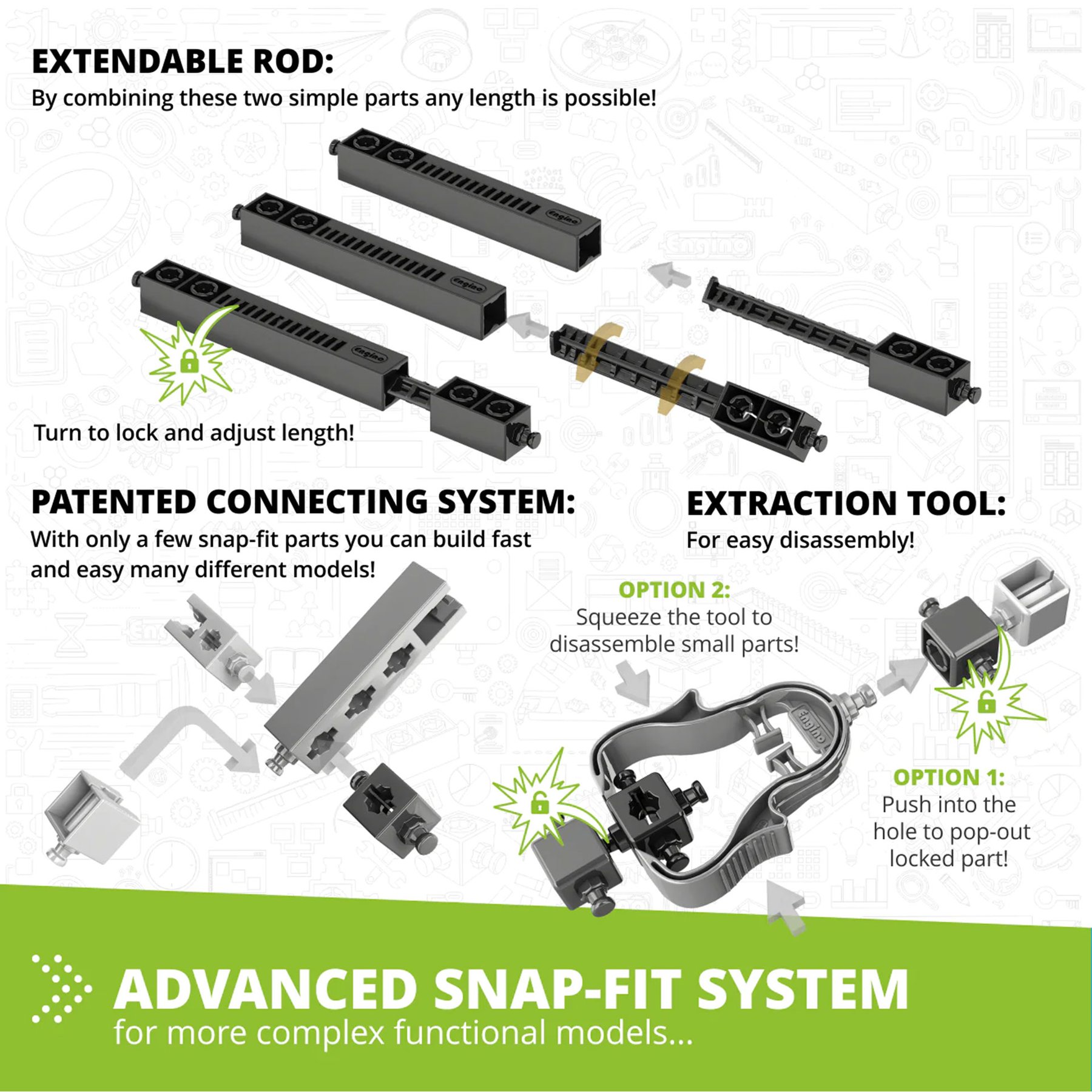 Комплектът е подходящ както за учебна среда, така и за творчество в домашни условия. Конструкторът включва 137 части с нов, патентован дизайн. Можете да сглобите соларен хеликоптер, който ще ви помогне да научите повече за силата на слънцето. Научете как работят соларните панели и как може да бъде манипулирано теглото, за се контролира скоростта. Разберете повече и за механизма на крана с лебедка и как се вдигат тежките товари. Научете как силата се премества от една точка на друга и какво е значението на механичното предимство и как може да бъде използвано. Комбинирайте две модерни технологични предимства, за да създадете невероятен соларен робот. Научете как да преобразувате слънчевата енергия в електричество.Продуктът е подходящ за деца над 9-годишна възраст.