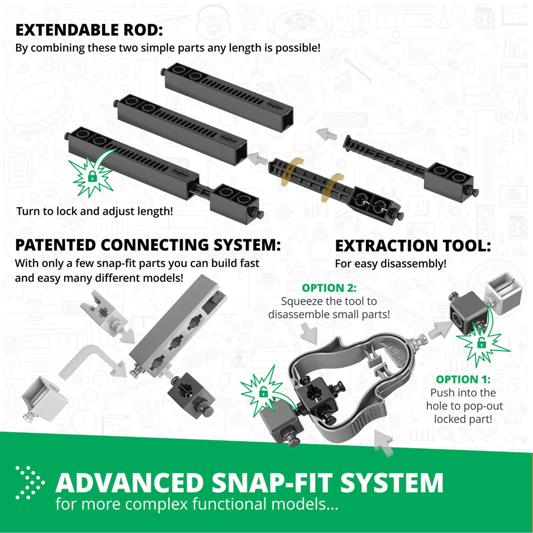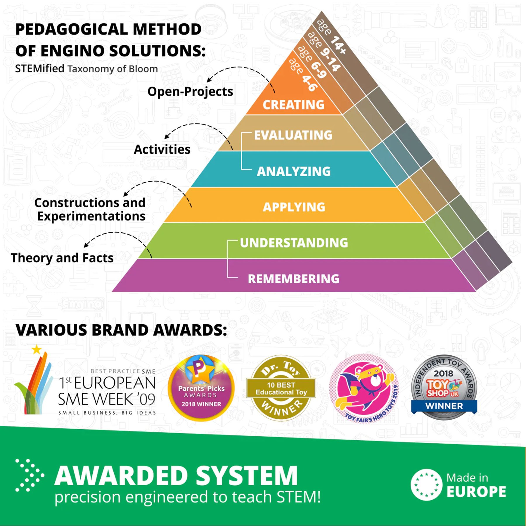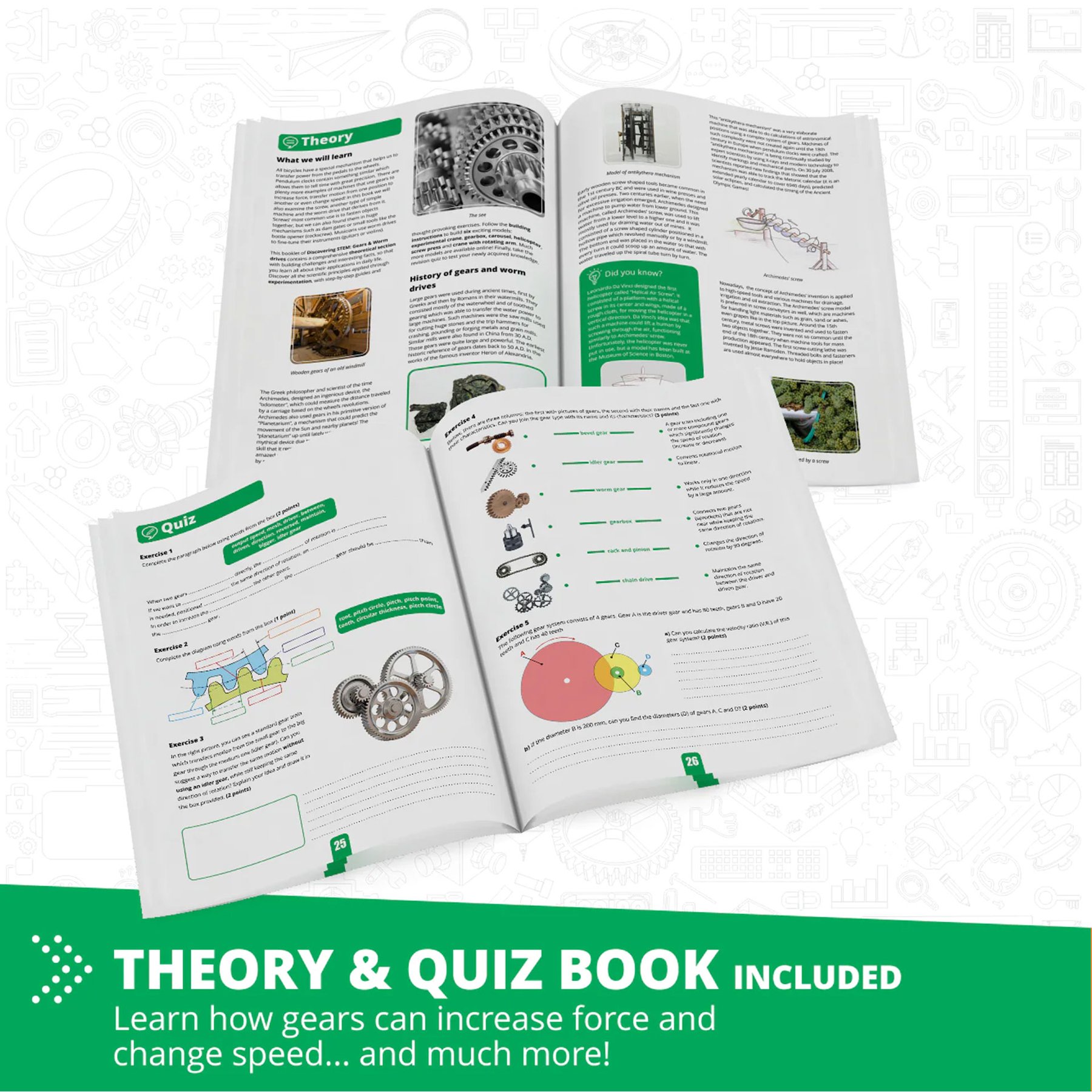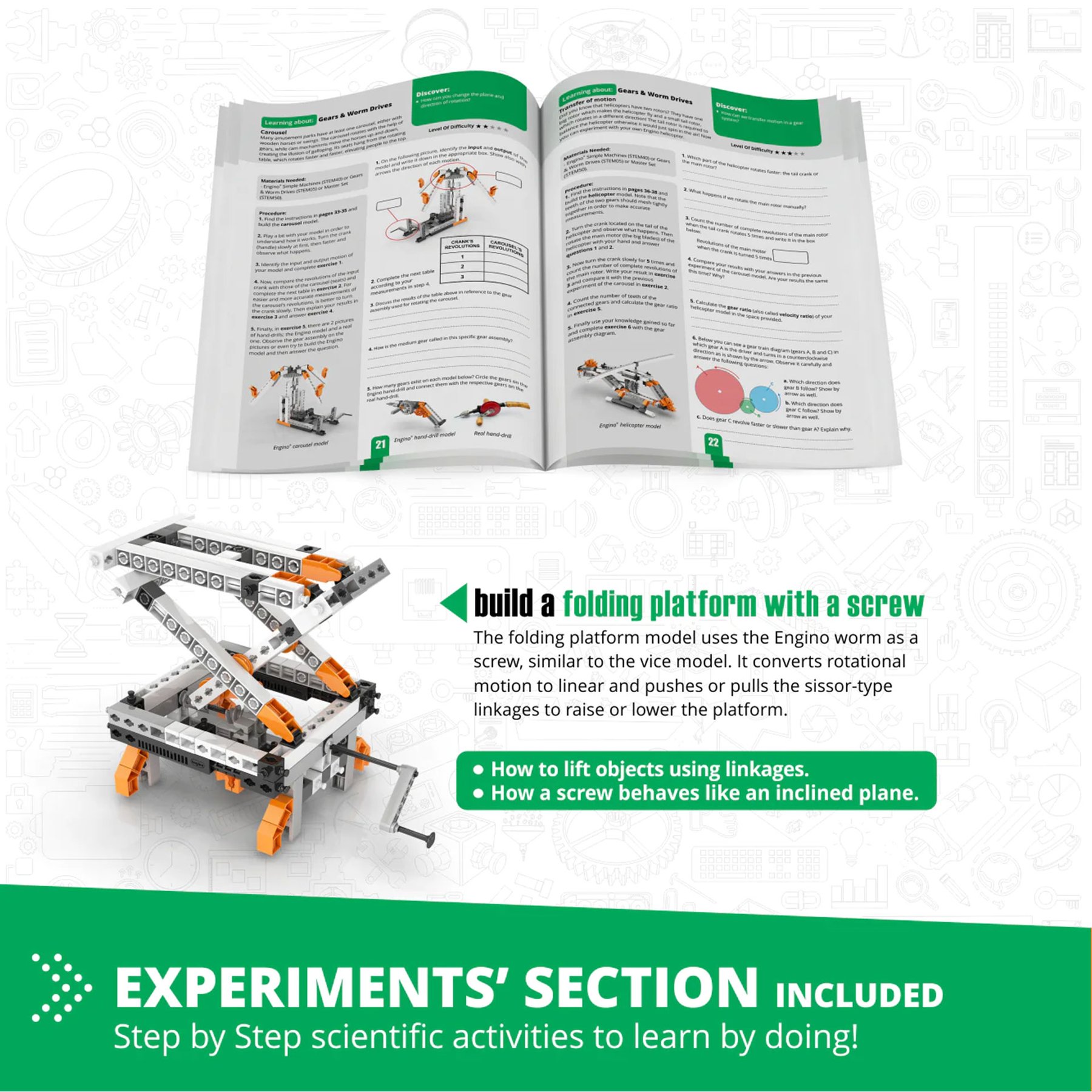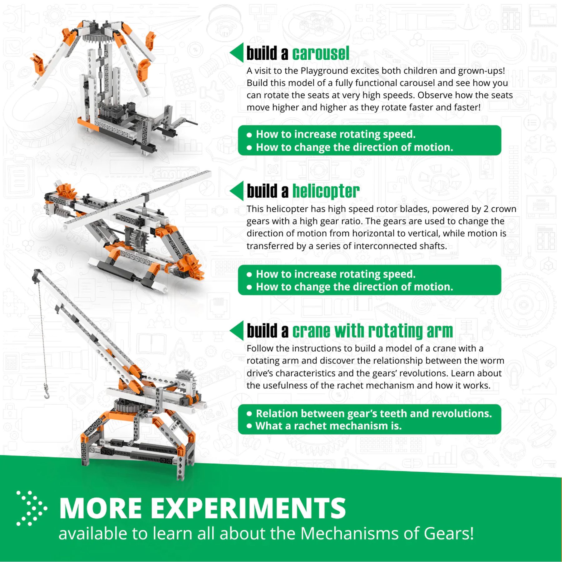 Образователен конструктор за сглобяване - Трансмисионни Устройства: Вашето дете може да построи 12 модела, предложени от производителя и да изобрети неограничено количество собствени модели. Това не са просто статични конструкции, а активни модели, с които детето може да си играе. С помощта на комплекта децата могат да научат как зъбните колела могат лесно да увеличават или намаляват скоростта, да променят силата или да предават движение от една позиция на друга. Открийте как трансмисионните устройства се използват за намаляване на скоростта на въртене и как винтовете превръщат ротационната скорост в линейна като едновременно увеличават нейната сила. Сред моделите, които могат да бъдат построени са: експериментален кран, механизъм със зъбни колела, въртележка, хеликоптер, винтоверт и кран с въртящо се рамо. В приложената книжка освен инструкции ще откриете подробни обяснения за различните научни принципи, които действат при различните построени модели, както и иновативни практически примери, които децата могат да изпробват и да учат докато играят. Има раздел с викторина, за да могат децата да проверят и затвърдят новите си знания! Някои от подробните експерименти, които могат да бъдат реализирани са: как диаметъра на зъбните колела се отразява на силата и скоростта; как да се изчисли съотношението на зъбните колела дори и за сложни конструкции; как да се използват трансмисии, за да се смени посоката и равнината на движение; как да се изчисли механичното предимство на един винт; какво е трансмисионно устройство и за какво се използва. Серията ENGINO MECHANICS™ е разработена от квалифицирани педагози и учени като са използвани най-новите тенденции в образованието, които комбинират теорията и практиката. Серията конструктори използва основни теми от учебния материал, свързани с физика, математика, технологии, инженерни науки. Всеки един комплект съдържа книжка с експерименти, която обхваща широк спектър от теми - механика и прости механизми, структури, законите на Нютон, възобновяеми енергийни източници и дори програмируеми роботи! Възрастова група: 9 - 16+. Образователни характеристики: развива фината моторика, пространственото мислене и въображение, техническите умения. Всички конструктори Engino са напълно съвместими помежду си, което дава възможност на децата да проявят своята фантазия и творчески способности и да създадат разнообразни конструкции! Основни детайли на конструктора: греди с отвори за закрепяне, многостенници, които захващат гредите в една от шест възможни посоки и крепежни елементи за подвижни или фиксирани съединения между детайлите. Гредите са с променлива дължина, могат да се съединяват Т-образно, да се захващат в права линия, да се въртят в различни посоки и да се закрепят под какъвто и да е ъгъл. В нито един друг конструктор няма да откриете толкова разнообразни начини на закрепване на детайлите, осъществени благодарение на патентованата система ENGINO®. Брой детайли: 152. Съдържание: детайли от пластмаса, приспособление за разглобяване, 17 страници подробна цветна инструкция плюс възможност за сваляне на бонус инструкции от електронната страница на производителя, 16 страници с теория и невероятни факти, 6 страници с научни експерименти, 3 страници с викторина за проверка и затвърждаване на научените факти. Батер