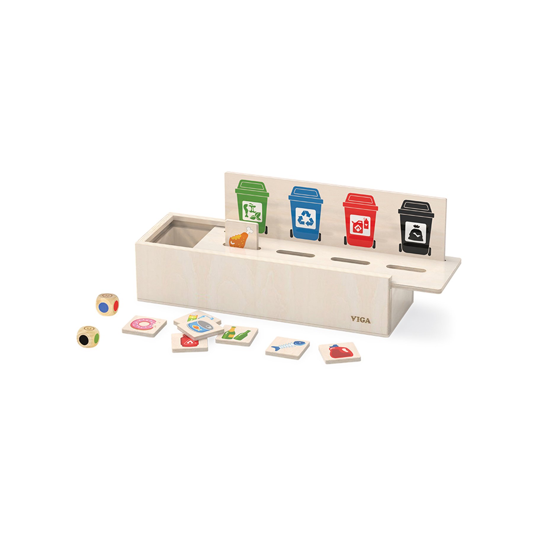 Образователна игра с цел да научи децата на разделно изхвърляне на отпадъци, за да не се замърсява околната среда. Комплектът представлява кутия с 4 дупки за изхвърлянето на отпадъците. За проверка дали задачата е изпълнена правилно, на гърба на всеки дървен "отпадък" е изобразен цвета на дупката, в която трябва да отиде. Състои се от 13 елемента. Размери: 29.5 х 12 х 8.3 cm. Материал: дърво. Предназначен за деца над 3-годишна възраст.