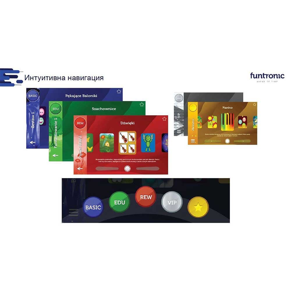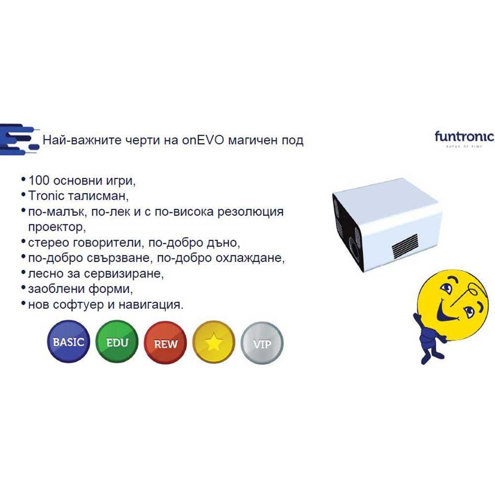 Всяко устройство има 100 основни игри, които са смесица от игри за забавление, учене и рехабилитация.Може да се използва за образователни дейности, гимнастика или логопедия, изучаване на чужд език или просто за забавление.Пакетът EVO е предназначен за дневни грижи, детски градини, класове от 1 до 3 от основното училище, игрални зали и други места, където децата или цели семейства прекарват времето си.
