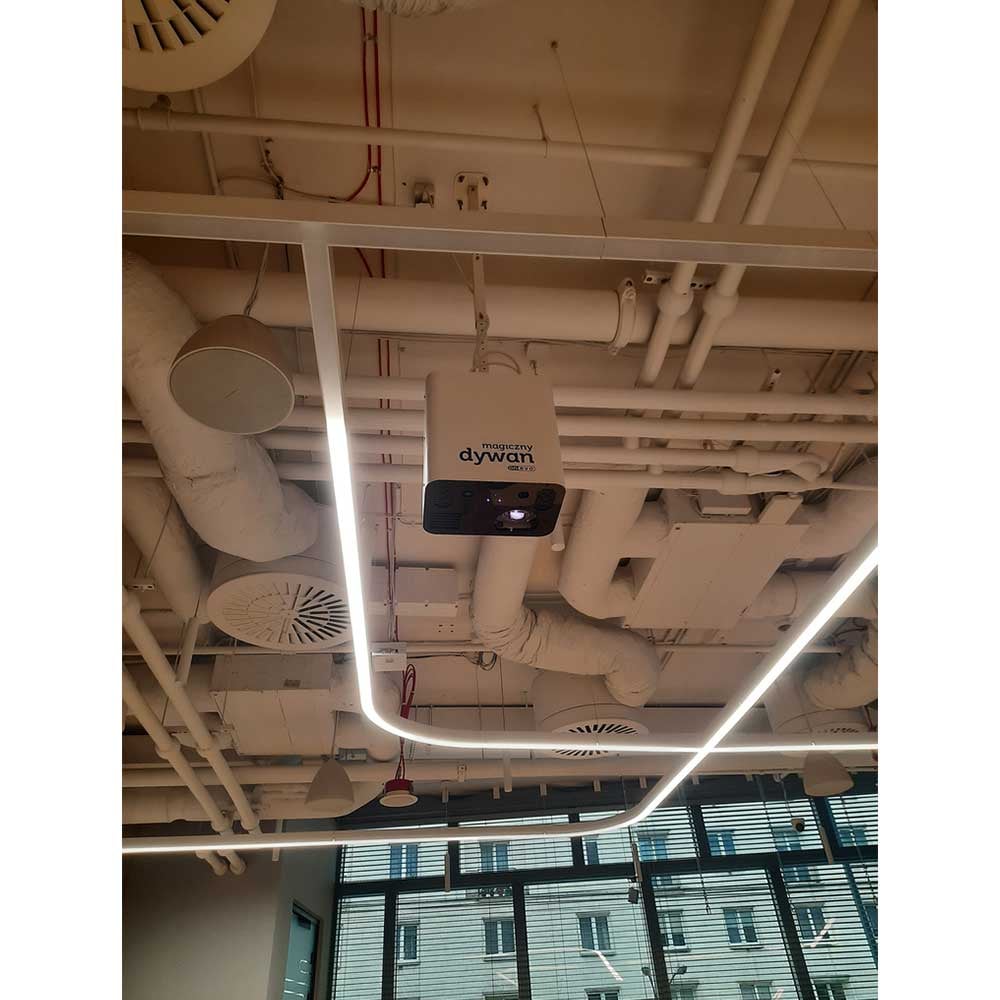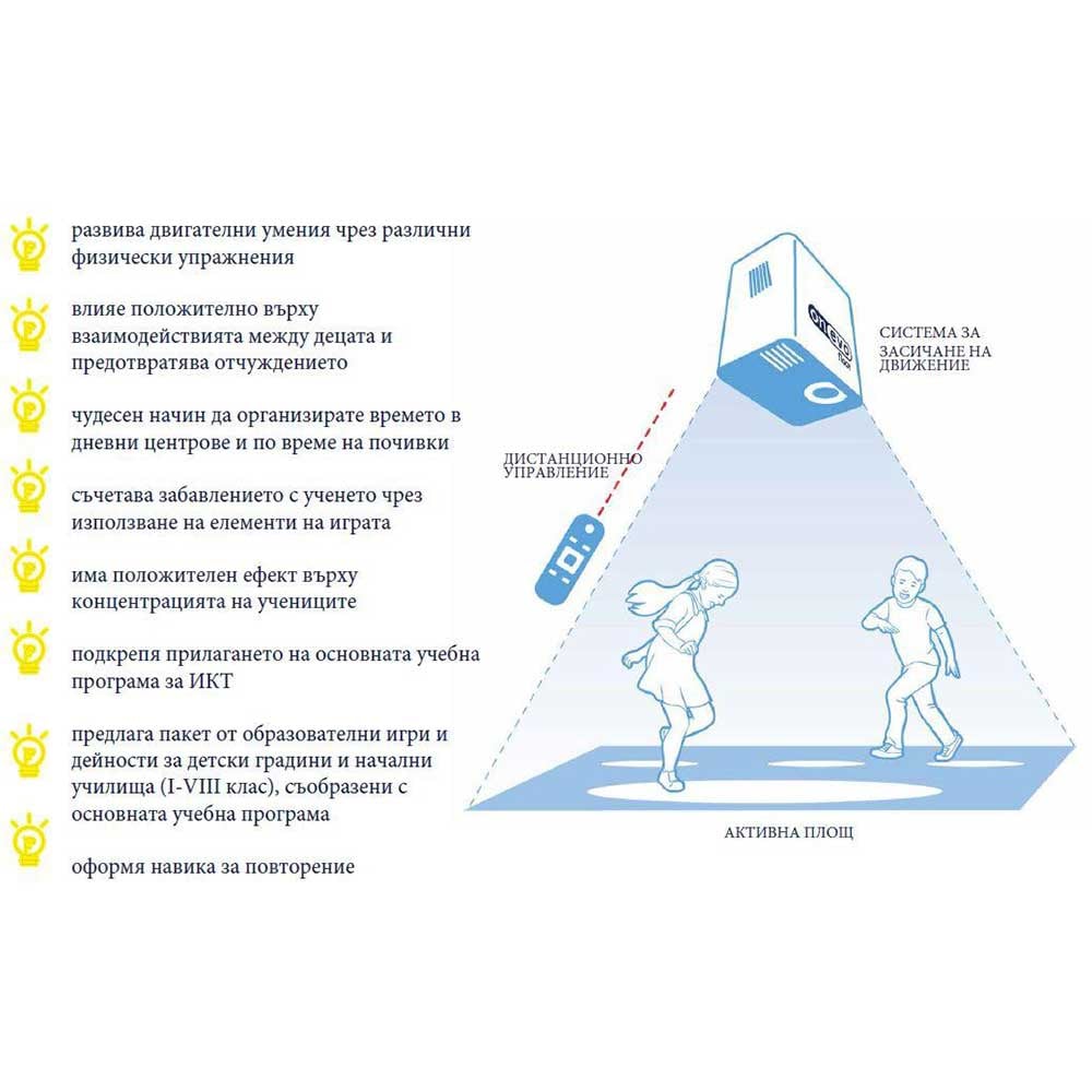 Изображението, показано на пода, създава виртуален интерактивен под, на който децата могат да изживеят страхотни приключения.Учителите получават материална и дидактическа подкрепа под формата на методически пакет, който отговаря на изискванията на основната учебна програма.Размерът на показаното изображение зависи от височината, на която устройството е монтирано и е подобен на правоъгълник с размери 2 х 3 метра.Изключително лесен за използване: само с дистанционно управление. Управлява се по подобен начин като домашен телевизор.