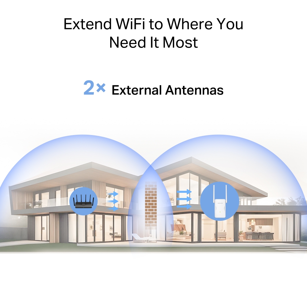 Разширете покритието на вашия рутер. Този разширител на обхват BE3600, с две регулируеми антени с висок коефициент на усилване, усилва WiFi до труднодостъпни места и е съвместим с по-стари WiFi стандарти (11b/g/n/a/ac/ax) и всички свързани устройства.