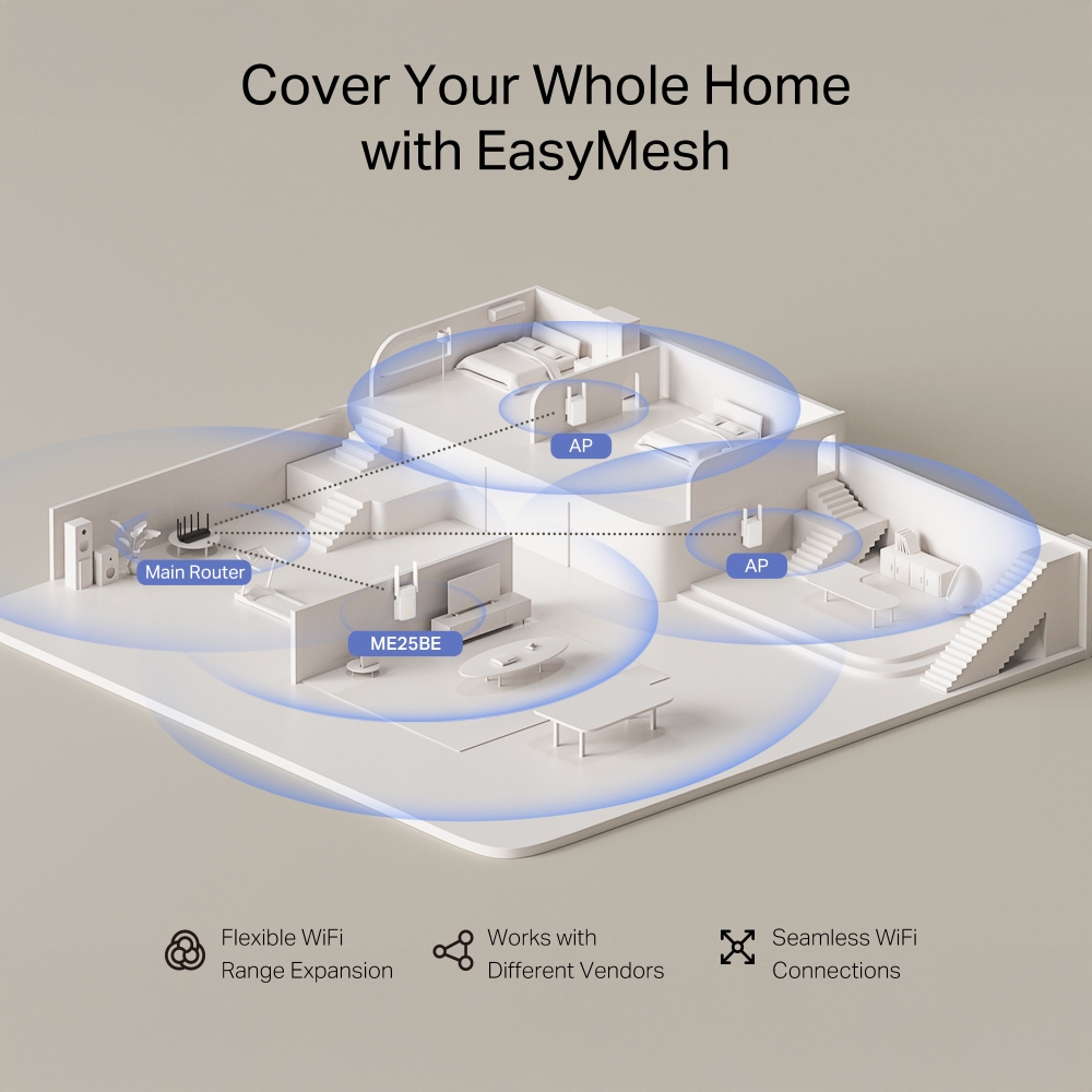 ME25BE е съвместим с EasyMesh, което ви позволява да настроите цяла домашна mesh мрежа с едно WiFi име и парола с всякакви други точки за достъп, които поддържат EasyMesh от множество доставчици. Насладете се на гъвкава, мащабируема и безпроблемна mesh WiFi мрежа в целия си дом!