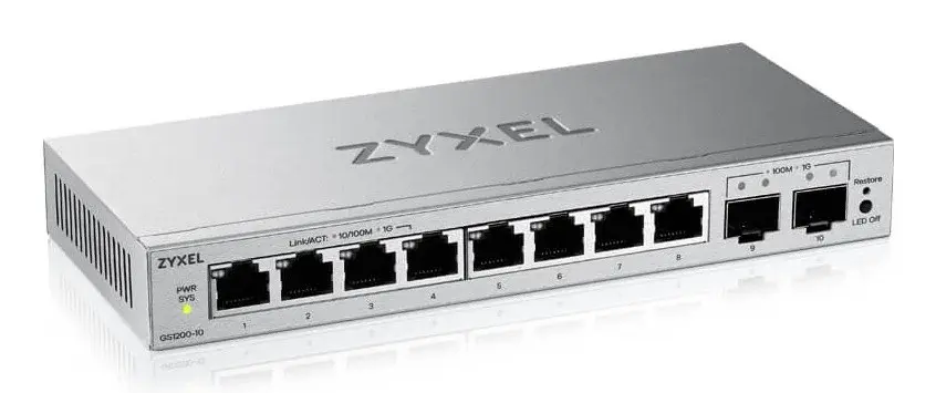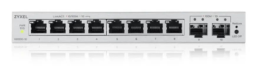 Zyxel GS1200-10 v3 е компактен управляем (web-managed) Layer 2 суич, предназначен за малки офиси и бизнес среди, които изискват стабилна и гъвкава мрежова инфраструктура. Разполага с 8 Gigabit LAN порта и 2 SFP uplink слота за свързване към оптична мрежа или backbone.