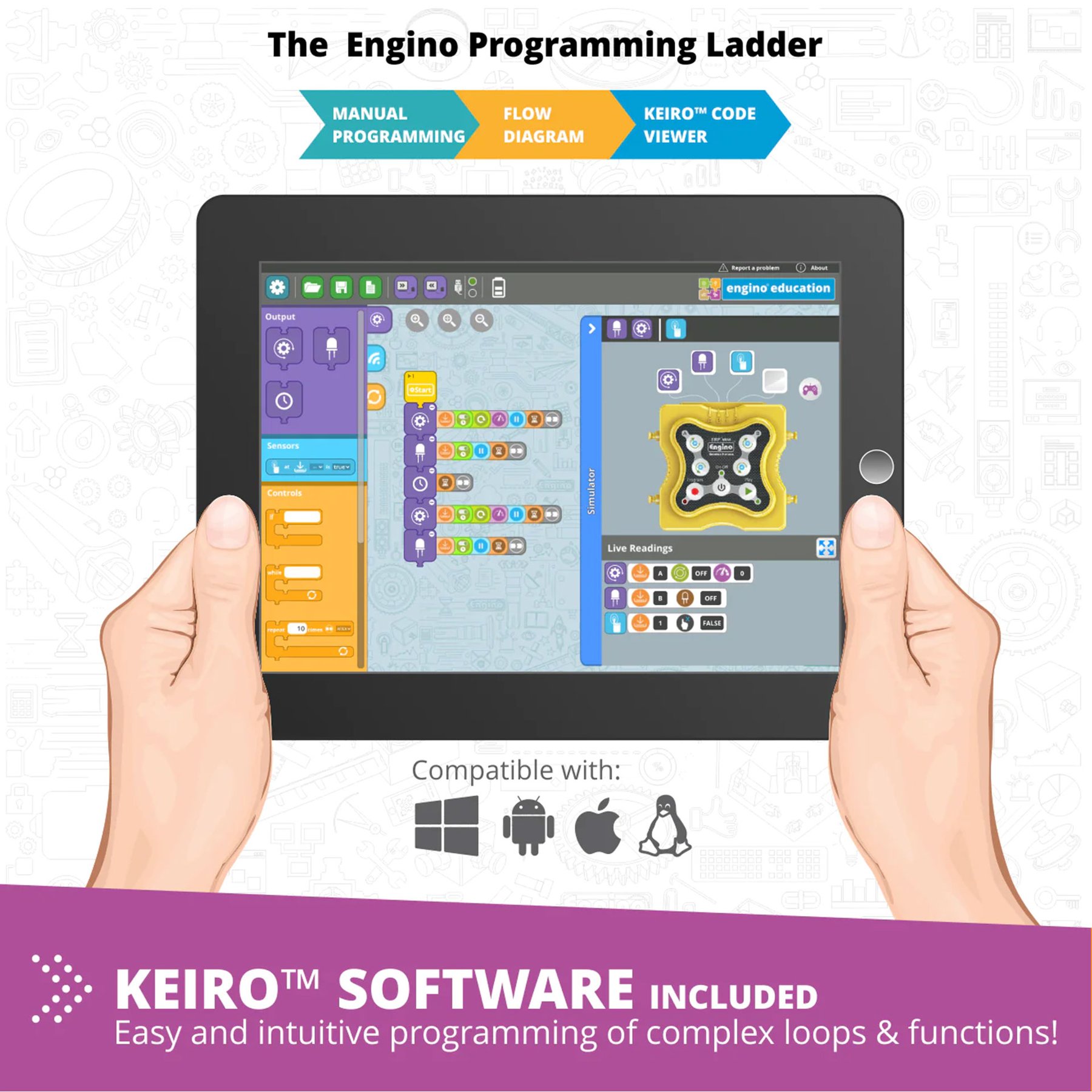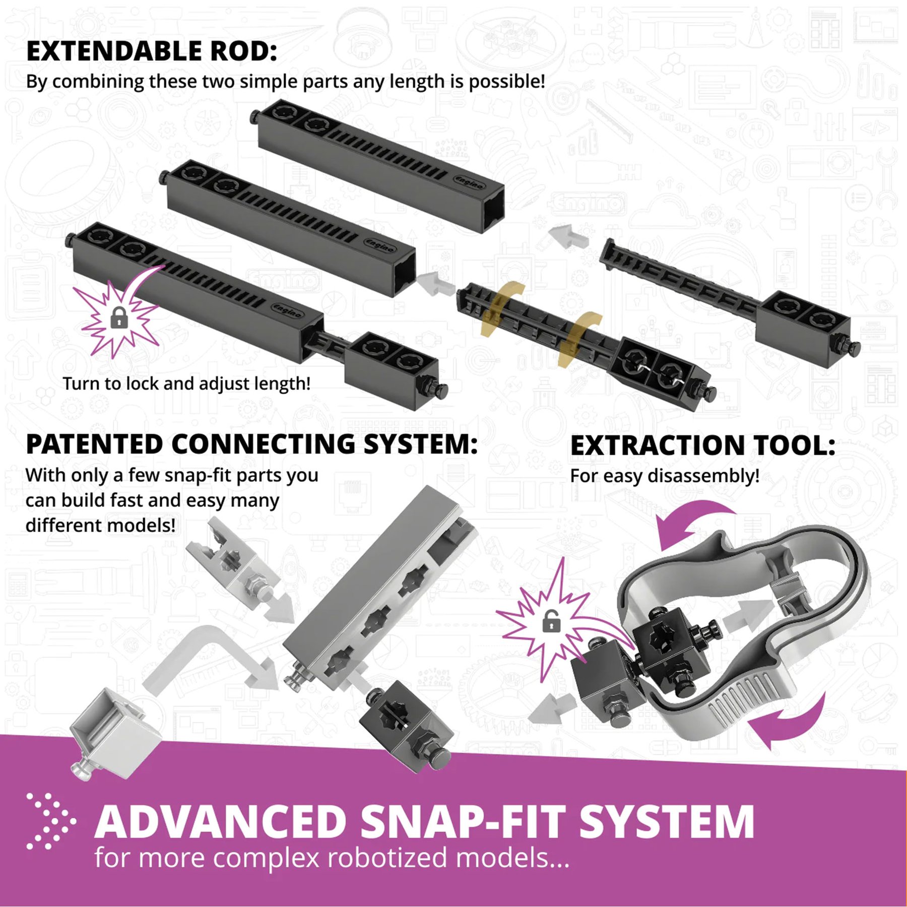 Образователният комплект Junior Robotics е специално разработен за ученици от предучилищна възраст и началното училище на възраст 5-7 години. Той съчетава основните предмети на STEM с роботика. Комплектът се предлага в удобна пластмасова кутия за съхранение, която съдържа голям брой пластмасови части Engino - Qboidz и роботизирани устройства, като контролер ERP Mini, двигател за постоянен ток, светодиод и сензор за докосване, позволяващи конструирането на 8 роботизирани STEM модела. Възможност за свързване чрез USB и Bluetooth. Съдържание на опаковката: